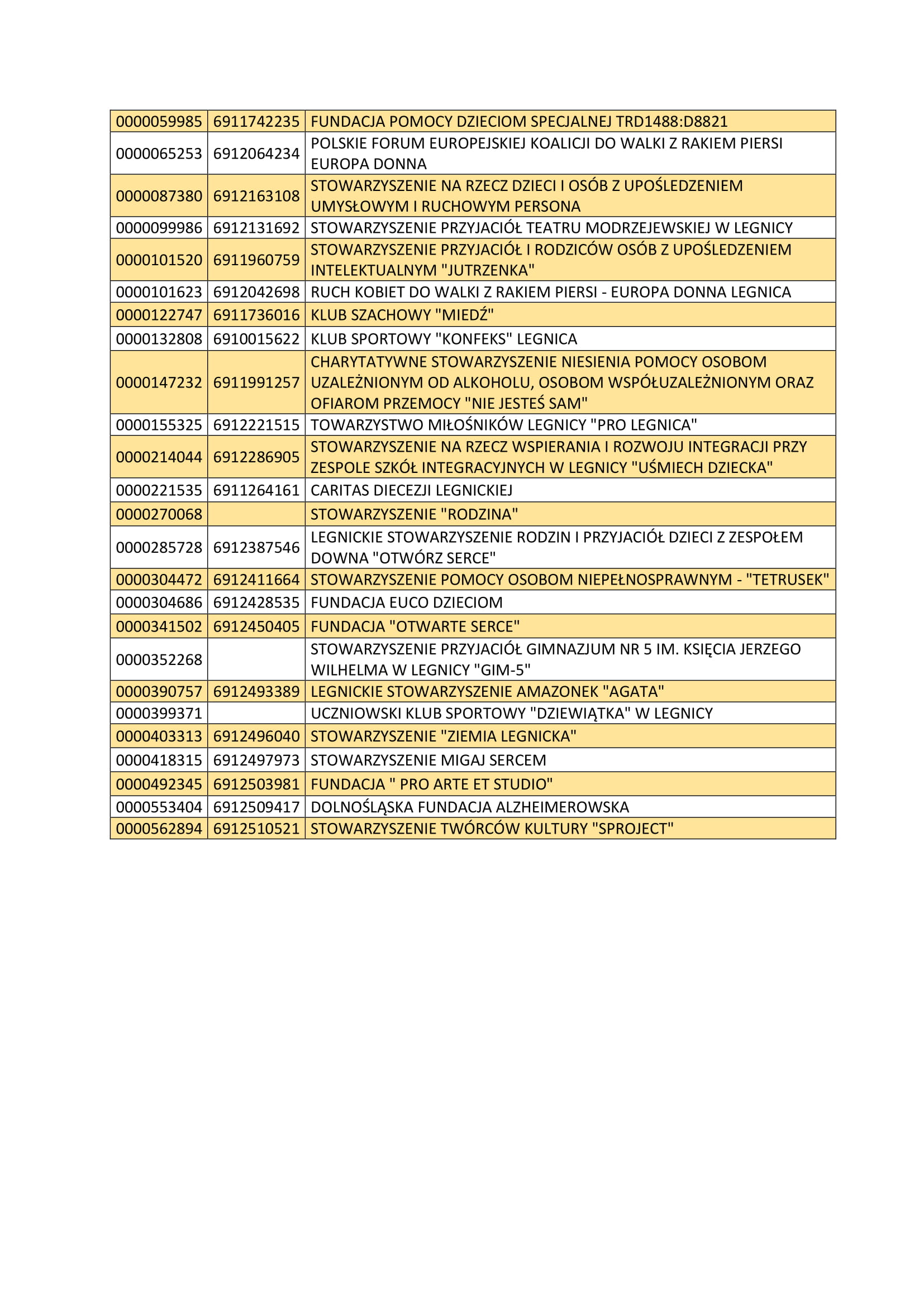 W Legnicy działa 25 organizacji, które posiadają status organizacji pożytku publicznego, uprawnionych do otrzymania 1% podatku dochodowego od osób fizycznych za 2019 rok zgodnie z art. 27a ust. 1 i 3 ustawy z dnia 24 kwietnia 2003 r. o działalności pożytku publicznego i o wolontariacie – t.j. Dz. U. z 2019 r. poz. 688, z późn. zm.